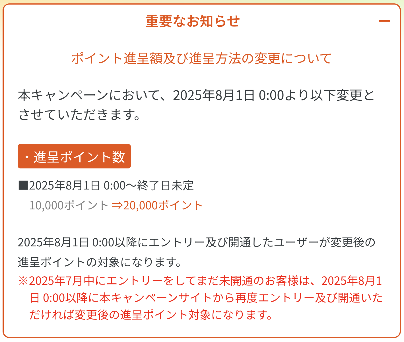 この変更により、現在エントリーすることで倍額の特典を受け取ることができます。