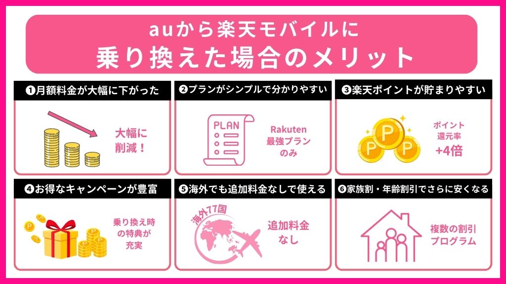 デメリットがある一方で、auから楽天モバイルへの乗り換えには多くのメリットがあります。