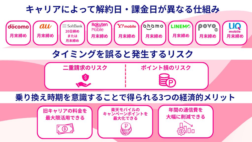 月末(23日〜25日頃)に申し込みを開始し、旧キャリアの締め日までに乗り換えを完了させることで、二重請求を最小限に抑えられます。