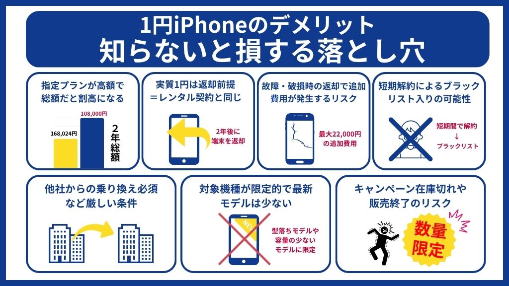 1円iPhoneは確かに魅力的な選択肢ですが、その裏には多くのデメリットや落とし穴が存在します。