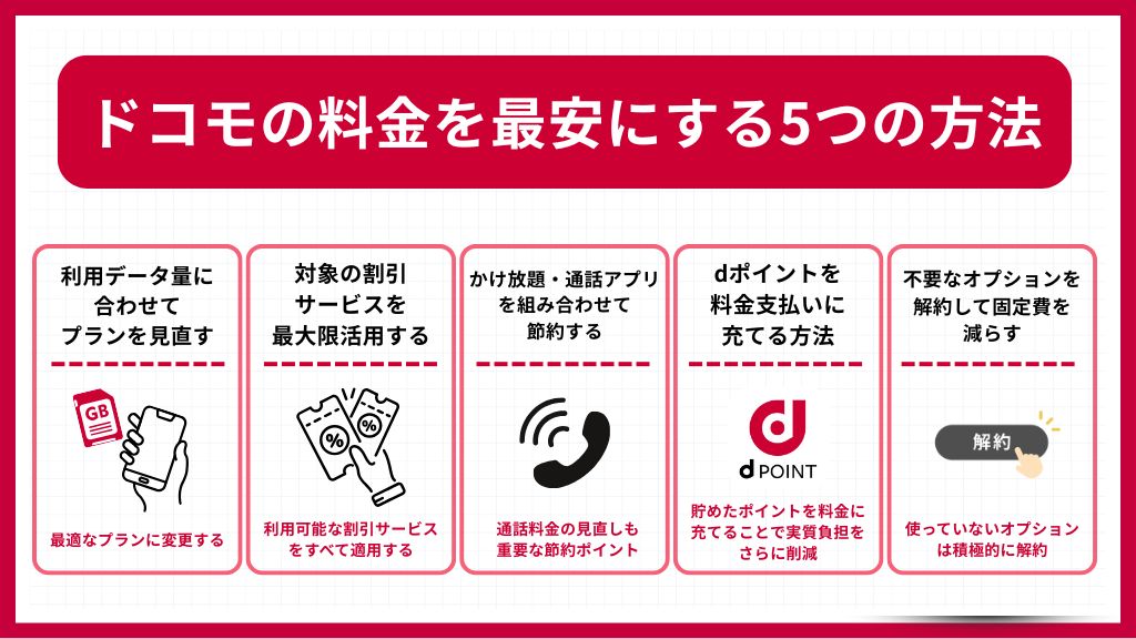 ドコモの料金を最安にするための具体的な方法について、5つご紹介します。