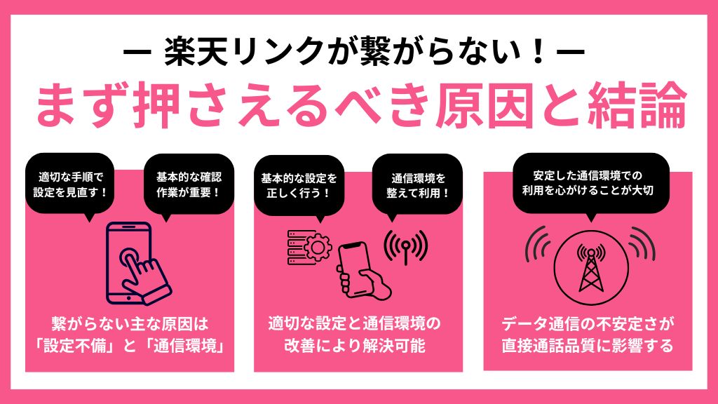 実際のところ、楽天リンクが繋がらない原因の多くは「設定の不備」や「通信環境の問題」にあり、適切な対処法を実践することで解決できるケースがほとんどです。