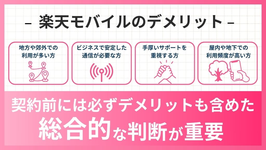 楽天モバイルのデメリットを事前に理解しておくことは、契約後の満足度を大きく左右します。