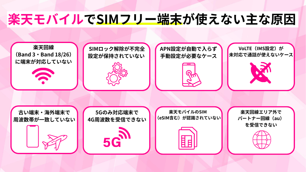 楽天モバイルでSIMフリー端末が使えない原因は、バンドが非対応である・APN設定の誤り・VoLTE無効化・SIMロック残存など多岐にわたります。