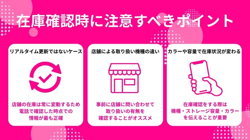 在庫の変動が早い機種ほど、事前確認の質が購入成功率を左右するため、店舗への問い合わせを上手に活用して効率的に端末を入手しましょう。